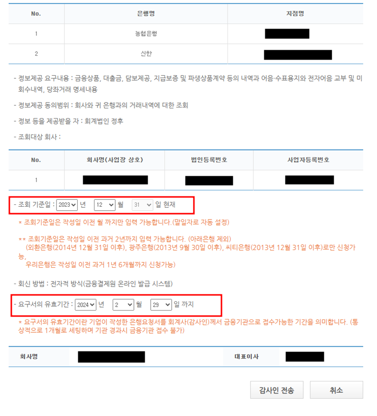 1) 은행조회서 : 전년도 회사가 거래하고 있는 모든 은행을 조회 (지점별로 선택)