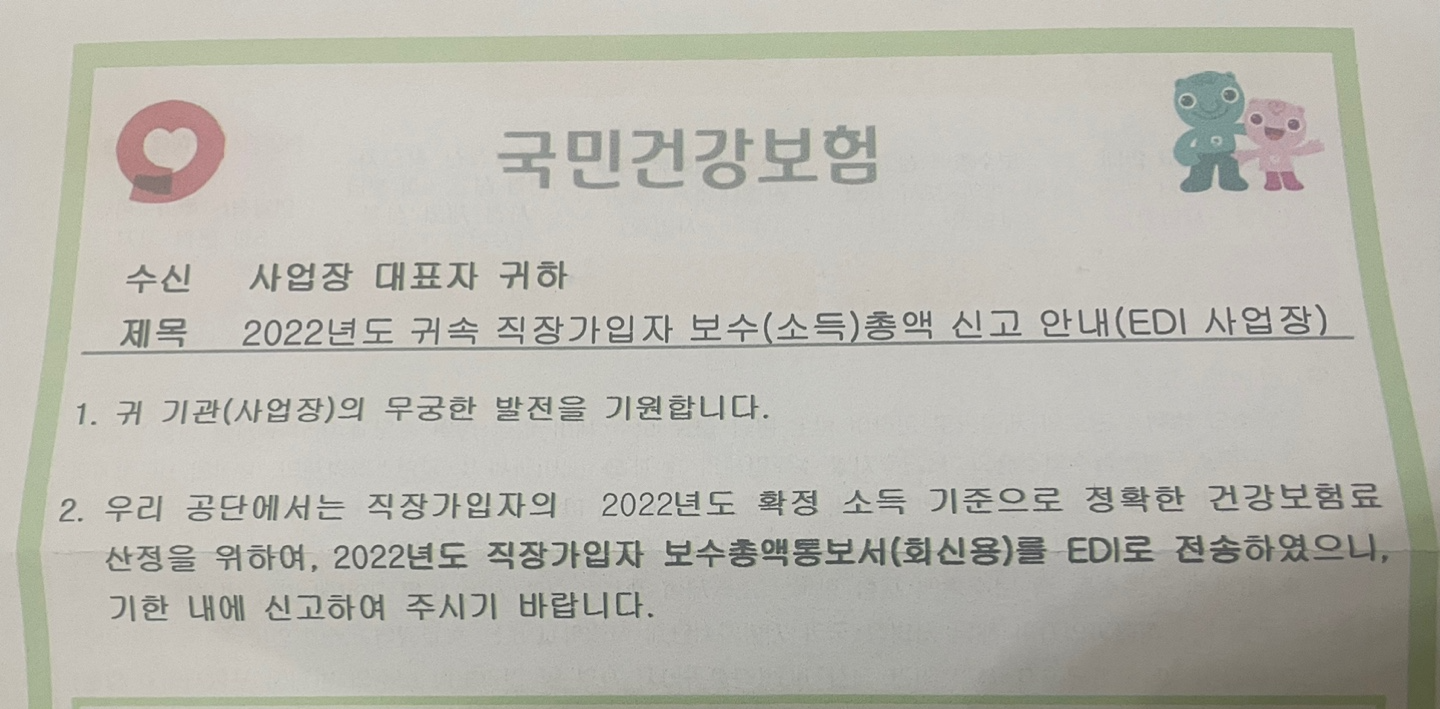 이쯤이면 국민건강보험에서 22년 보수총액 신고하라고 우편이 왔을 거예요.